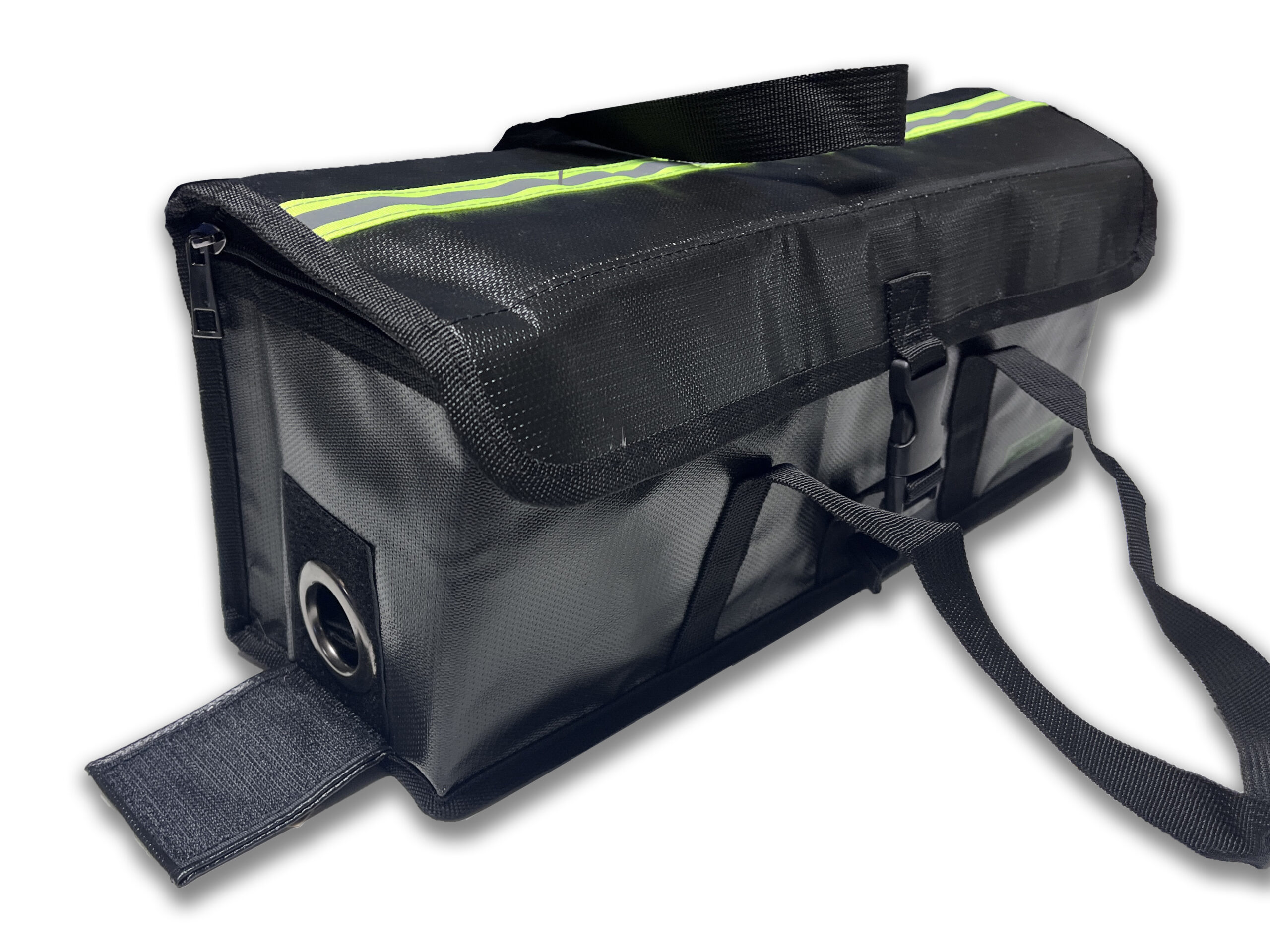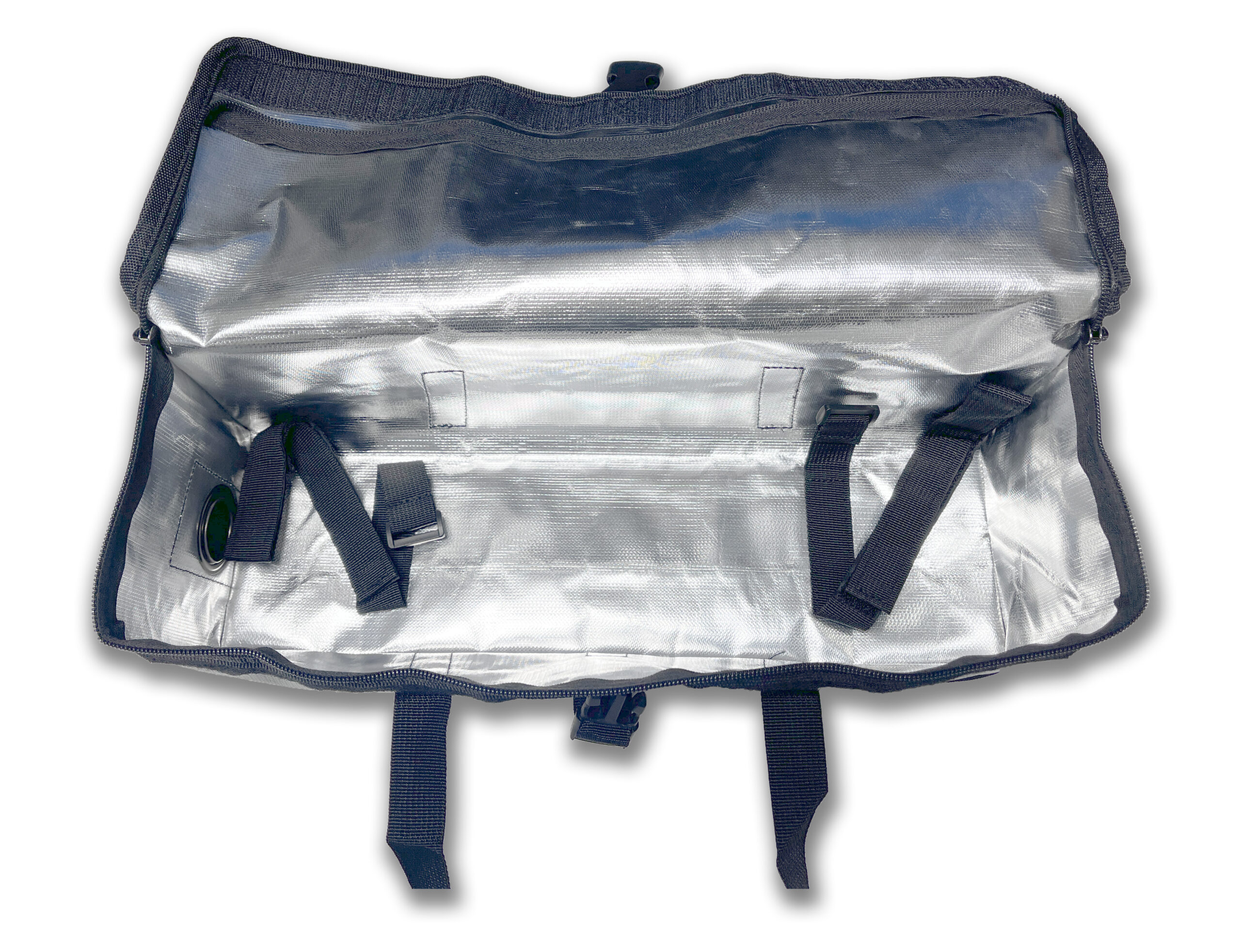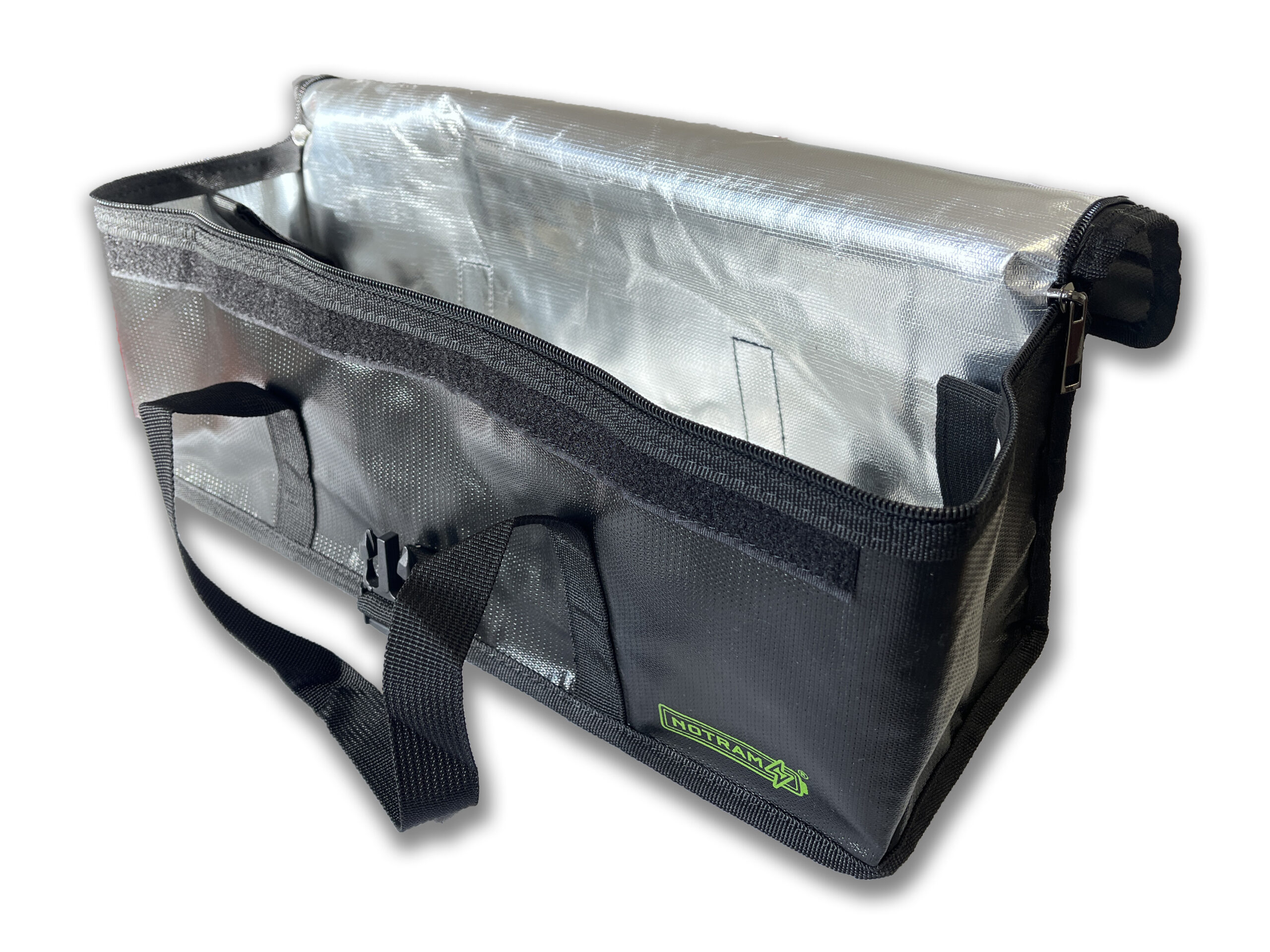 De tas is drievoudig beschermd tegen vuur, water en explosies en is hittebestendig tot 1800 °C, waardoor risico’s bij oververhitting sterk worden beperkt. De meeste van onze e-bike accu’s passen veilig in deze tas (max. 41 × 13 × 12 cm).